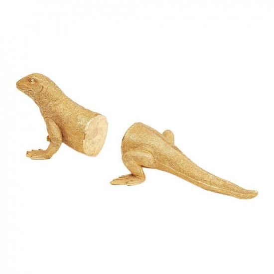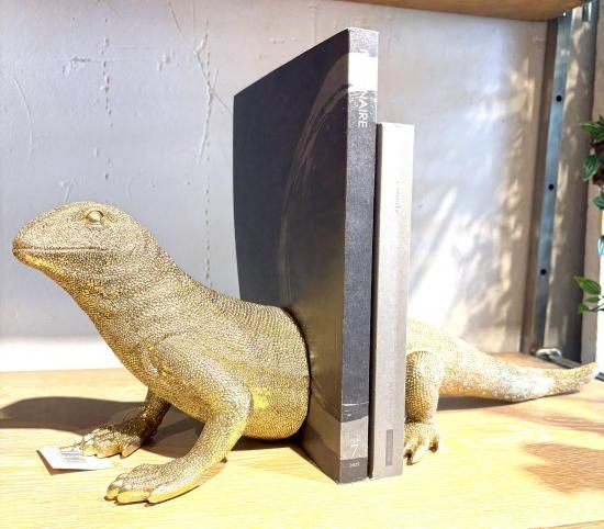 トカゲをモチーフにした華やかなゴールドのブックエンドは、空間をユニークに演出してくれます。